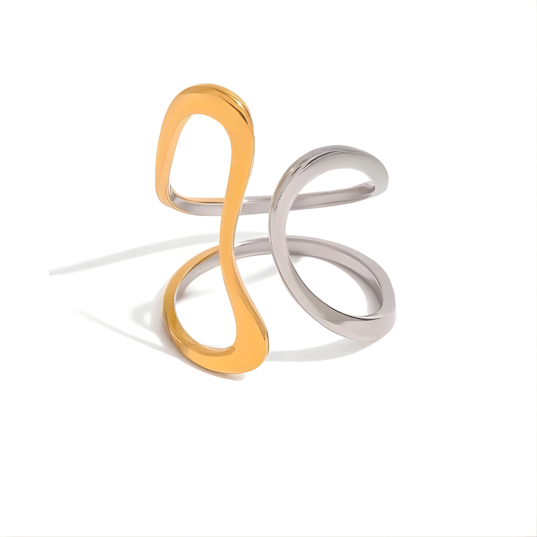 Crafted from premium 18K gold-plated stainless steel with contrasting silver accents, AMINA delivers innovative dual-tone design with contemporary sophistication. The flowing curves combined with mixed metal aesthetic create visual interest that complements all your jewelry seamlessly.