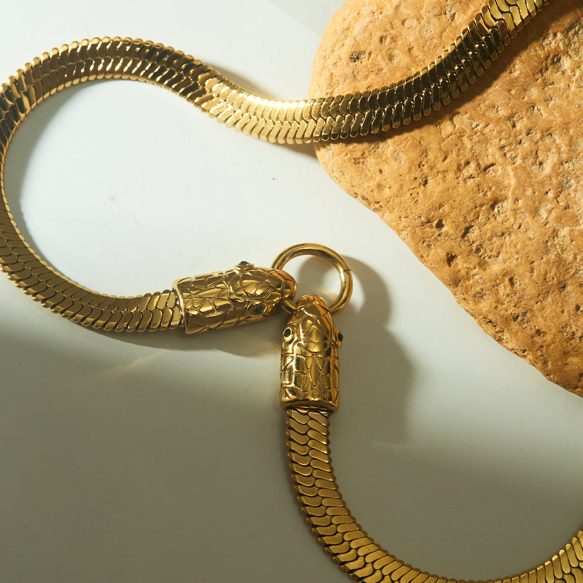 Strength and refinement unite in one extraordinary piece. The SERAPHIS GOLD necklace makes a powerful statement with distinctive symbolism - two snake heads connected through a central ring, representing duality, transformation, and eternal connection. The wide snake chain adds mysterious allure and sophisticated edge.