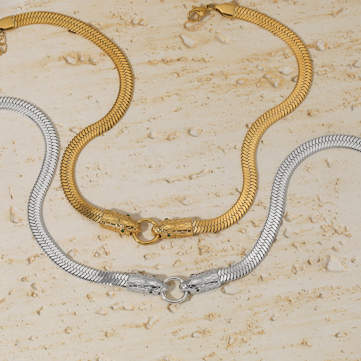 Crafted from premium 18K gold-plated stainless steel, SERAPHIS GOLD delivers substantial luxury with bold presence. The sculptural snake head details and chunky chain design create dramatic impact while maintaining elegant wearability.